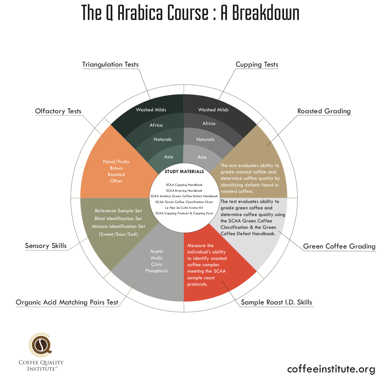 The Q Grader Program is a certification program offered by the Coffee Quality Institute (CQI). The purpose of the Q is to “create a skilled and credible body of coffee graders to consistently and accurately assess samples submitted for evaluation,” according to the handbooks we were given today. In other words, the Q is a way to create an objective standard for grading coffee. Hold on, let’s back up – why grade coffee?